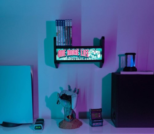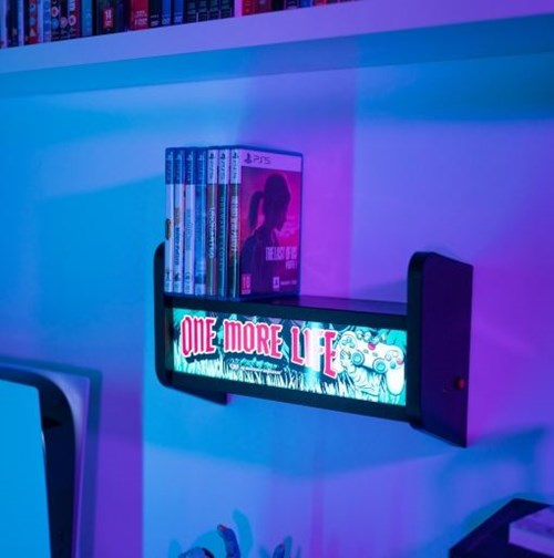 Lampada arcade ispirata alla pensilina delle macchine da gioco degli anni '90. Include una modalità di illuminazione LED a freddo, controllata da un pulsante laterale. Funziona con cavo USB tipo C 5V DC 1A (incluso e rimovibile) e batteria interna ricaricabile Li-ion 2000 mAh 3,7V, con fino a 6 ore di autonomia e ricarica massima in 3 ore e 30 minuti. Le pareti laterali sono rialzate per poterlo utilizzare anche come scaffale. È dotato di due ancoraggi posteriori per l'installazione a parete e include tasselli e viti. Materiali: MDF e acrilato. Misure: 34 x 22,5 x 14 cm.