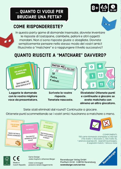 Gli altri ora scommettono sui vincitori - ci sarà un nuovo abbinamento? In Match Me, non è la conoscenza a contare, ma conoscere particolarmente bene i propri compagni di gioco. Ma come risponderanno alle domande impossibili da rispondere? Cosa pensano le ciotole di zuppa sia la migliore zuppa? Qual è la guarnizione preferita per il pane? Quanti cuscini servono su un letto d'hotel?Match Me è un gioco da festa per tutte le occasioni che offre spunti di conversazione e fa riflettere i giocatori su innumerevoli situazioni quotidiane.