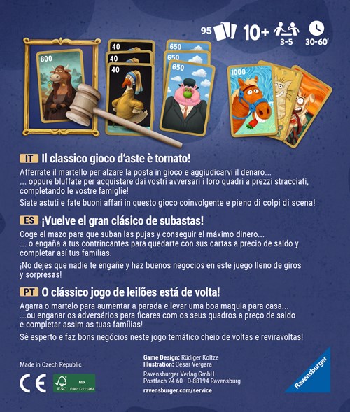 Ed è proprio per questo che il gioco per 3 - 6 amanti delle aste ne contiene una! Anche gli animali sono stati vestiti in modo speciale per l'anniversario e ora appaiono nello stile dei capolavori dell'arte! Quindi, prendete il martello e andate all'asta. Vincete i quartetti di animali più preziosi e ottenete il maggior numero di punti vittoria. E aspettate con ansia le numerose nuove varianti di gioco!