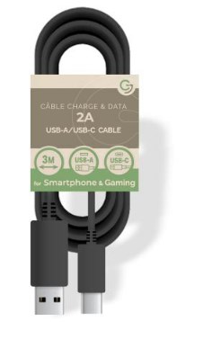 USB A/USB C Cable 5V/2A - 3m - PACKAGE-FREE - Black