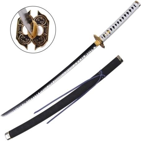 Katana fantasy liberamente ispirata a Devil May Cry con lama in acciaio, tsuba dorata, fodero in legno opaco ed impugnatura in tessuto bianco.