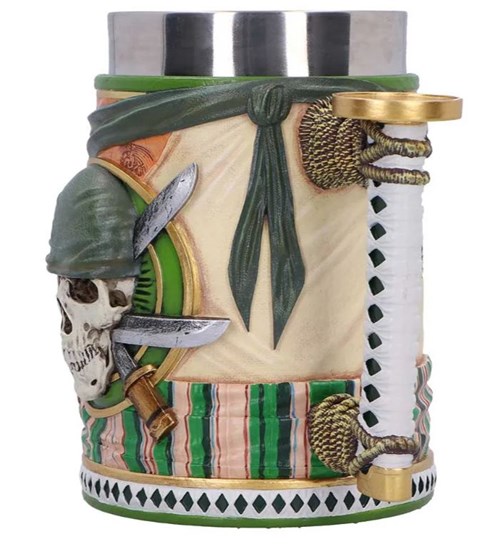 Decorato con l'emblema di Zoro sul davanti e il logo di One Piece sul retro. Il manico ha la forma dell'elsa della sua spada, il tutto fuso in resina e dipinto nei suoi iconici colori verde e bianco.