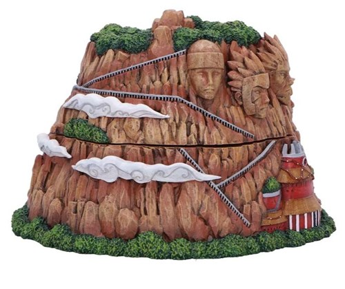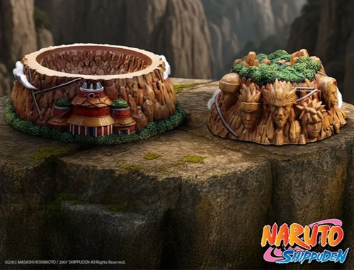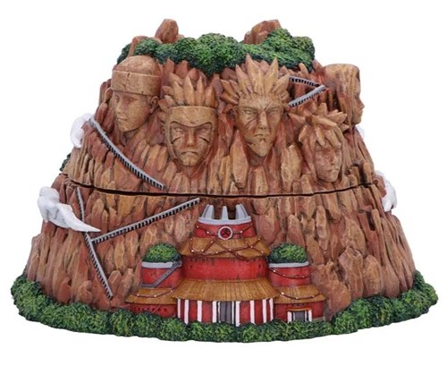 Volti intagliati di Hokage del passato, vegetazione dettagliata, nuvole fluttuanti, il villaggio di Konohagakure alla base e un coperchio rimovibile.