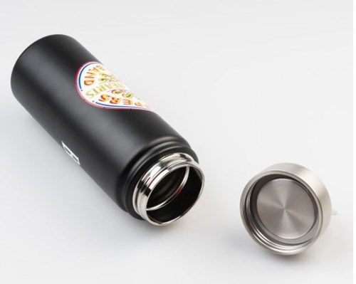 Bottiglia metallica in acciaio inossidabile a doppia parete. Mantiene le bevande calde fino a 12 ore e fredde fino a 24 ore. È dotata di tappo ermetico con manico per facilitarne il trasporto. La sua composizione è priva di BPA, il che garantisce un consumo sicuro per la salute. Non è adatta al microonde né alla lavastoviglie. Capacità: 550 ml. Misure: 21 cm di altezza e 7,3 cm di diametro.