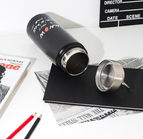 Bottiglia metallica in acciaio inossidabile a doppia parete. Mantiene le bevande calde fino a 12 ore e fredde fino a 24 ore. È dotata di tappo ermetico con manico per facilitarne il trasporto. La sua composizione è priva di BPA, il che garantisce un consumo sicuro per la salute. Non è adatta al microonde né alla lavastoviglie. Capacità: 550 ml. Misure: 21 cm di altezza e 7,3 cm di diametro.