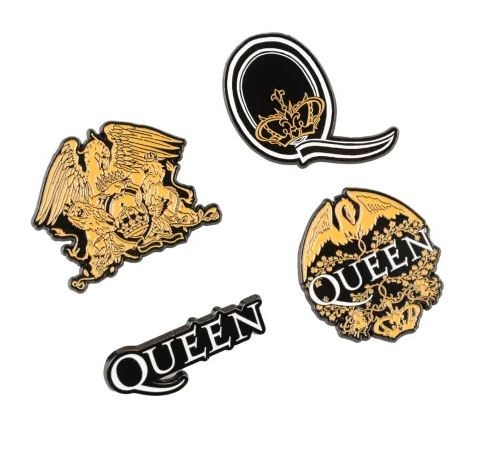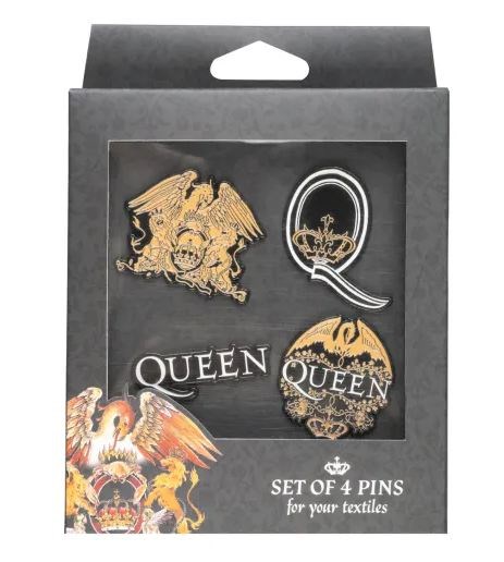 Set di quattro spille realizzate in lega di zinco con finitura smaltata. Sono dotate di una puntina sul retro per fissarle al tessuto e di una chiusura a farfalla in metallo, che si posiziona all'estremità della puntina per garantirne il fissaggio. La spilla si sgancia premendo il meccanismo della chiusura. Misure: 5 x 5 cm circa.