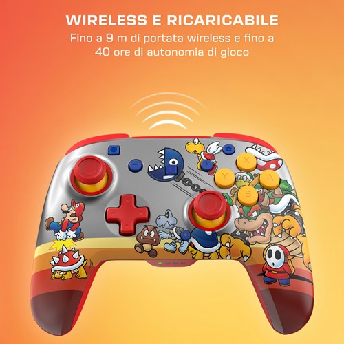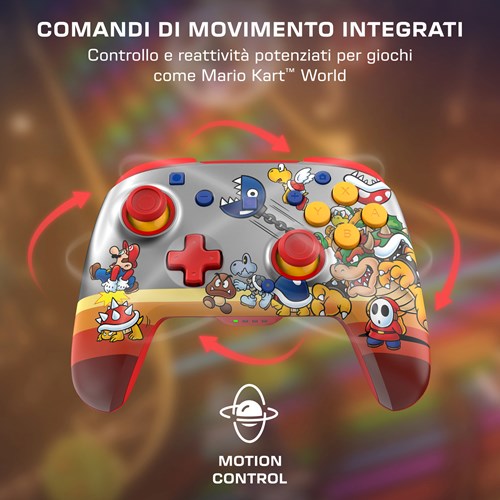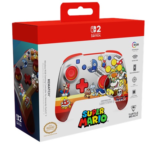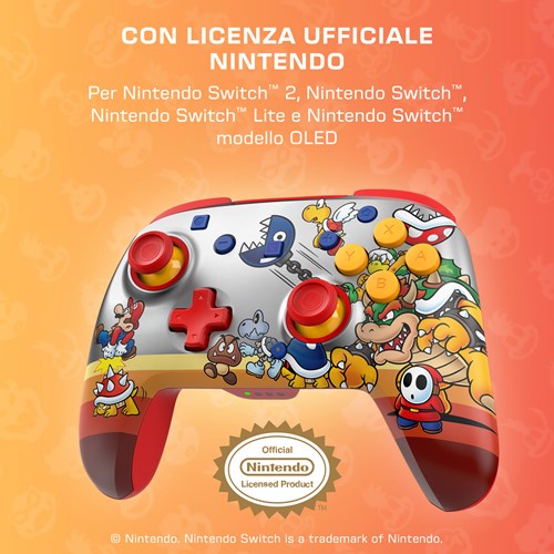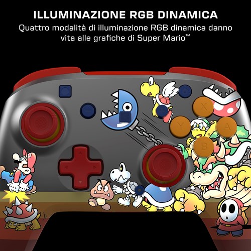 Unisciti alle fila dei Bowser’s Baddies e domina i tuoi rivali con il controller da gioco wireless RGB Koopa Troop Rematch™, con licenza ufficiale per Nintendo Switch™ 2. Compatibile anche con Nintendo Switch™, Switch™ Lite e Switch™ – Modello OLED, questo controller si illumina con quattro modalità RGB dinamiche che animano le grafiche iconiche di Super Mario™. Che tu stia driftando in Mario Kart™ World o conquistando nuovi orizzonti in Super Mario™ Galaxy, il controller Rematch tiene il ritmo mossa dopo mossa. Con un design elegante e funzionalità ottimizzate per le prestazioni, è l'alleato perfetto per elevare la tua esperienza su Nintendo Switch™ 2.